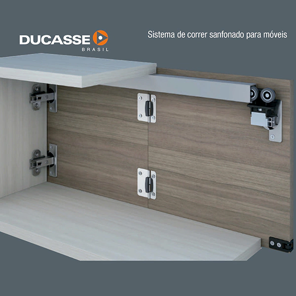 Sistema de correr sanfonado para móveis com aplicação em portas de pequeno a médio porte em madeira, MDF ou perfil de alumínio a partir de 45mm de altura. Kit testado e aprovado para 7.500 ciclos conforme norma ANSI-BHMA-A156.14-202 G1, tendo a capacidade de carga de 20Kg por folha.