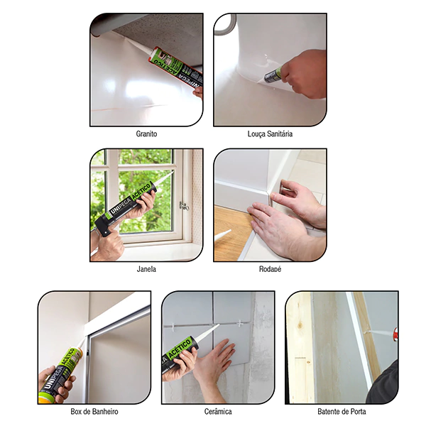 Silicone monocomponente cura acética indicado para vedação e colagem de alumínio, vidro, azulejo, louça sanitária e box de banheiro.